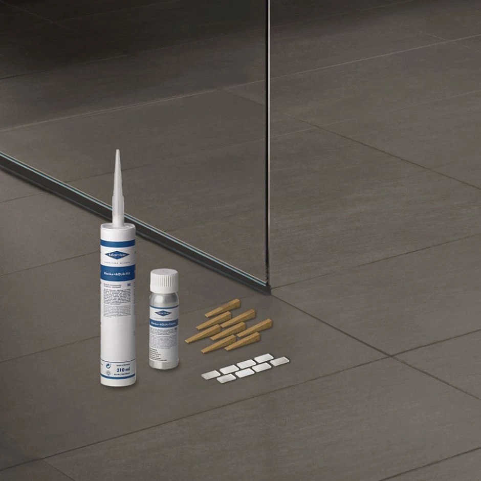 Das praktische AQUA-GLAS KIT 1 ist ein komplettes Montageset zum Einsetzen von Glastrennwänden in die AQUA-Fliesenprofile von Blanke. Das Kit 1 ist ausreichend zum Einsetzen einer Glasscheibe an Wand und Boden mit dem AQUA-GLAS Profil bis 2,1m und dem AQUA-KEIL GLAS Profil bis 1,48m.