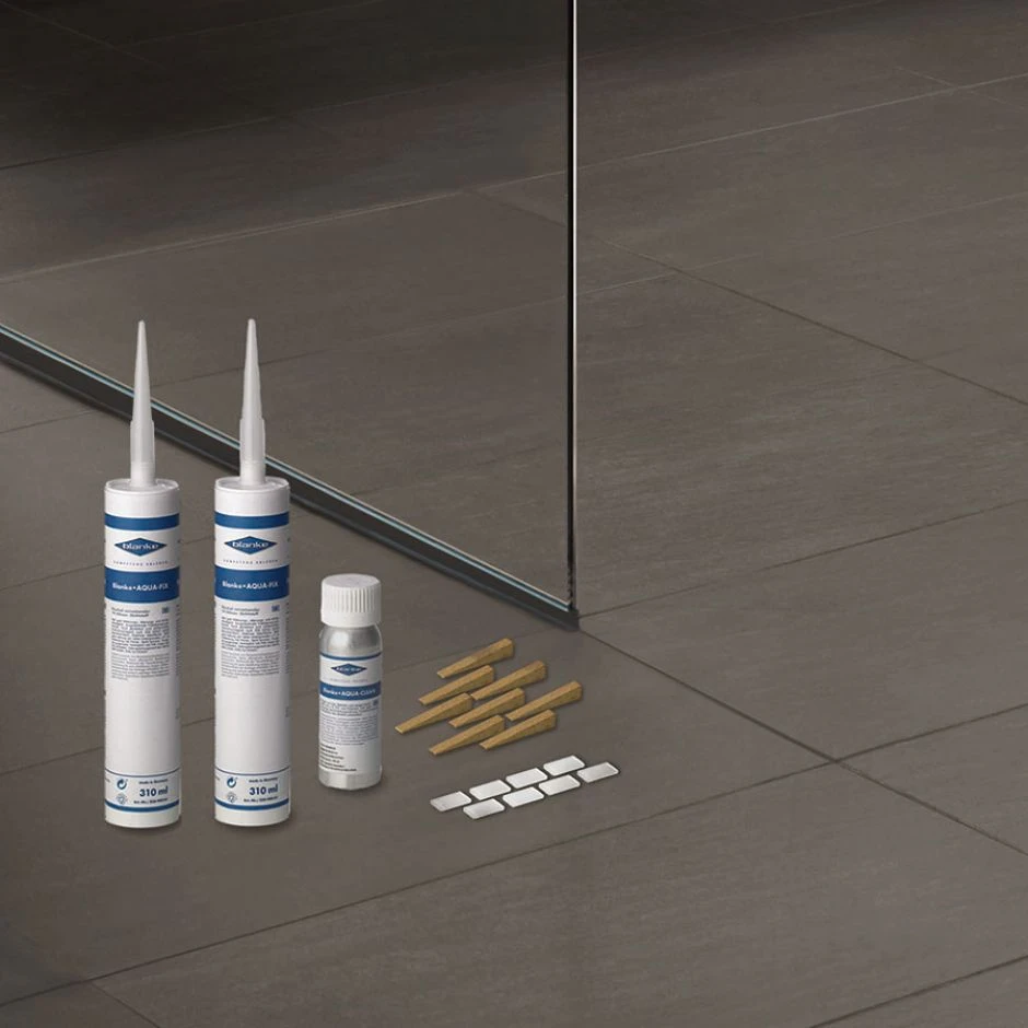 Das praktische AQUA-GLAS KIT 2 ist ein komplettes Montageset zum Einsetzen von Glastrennwänden in die AQUA-Fliesenprofile von Blanke. Das Kit 2 ist ausreichend zum Einsetzen einer Glasscheibe an Wand und Boden mit dem AQUA-GLAS Profil bis 2,1m und dem AQUA-KEIL GLAS Profil bis 2,0m.
