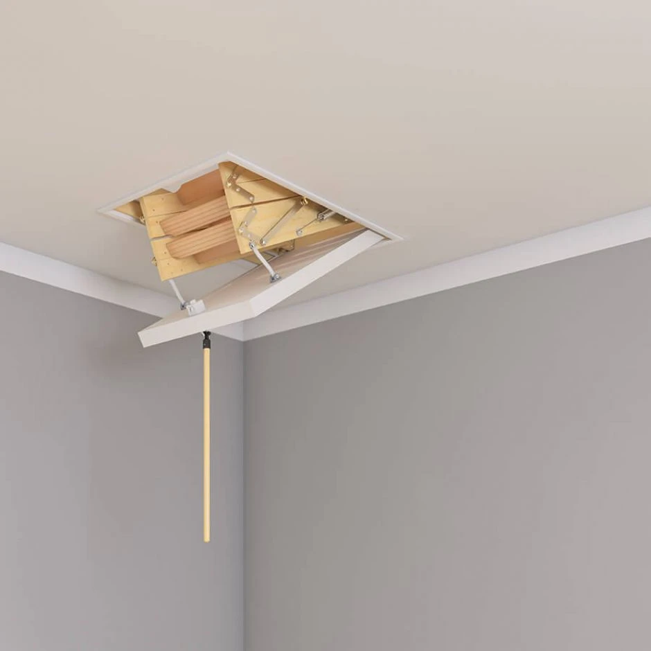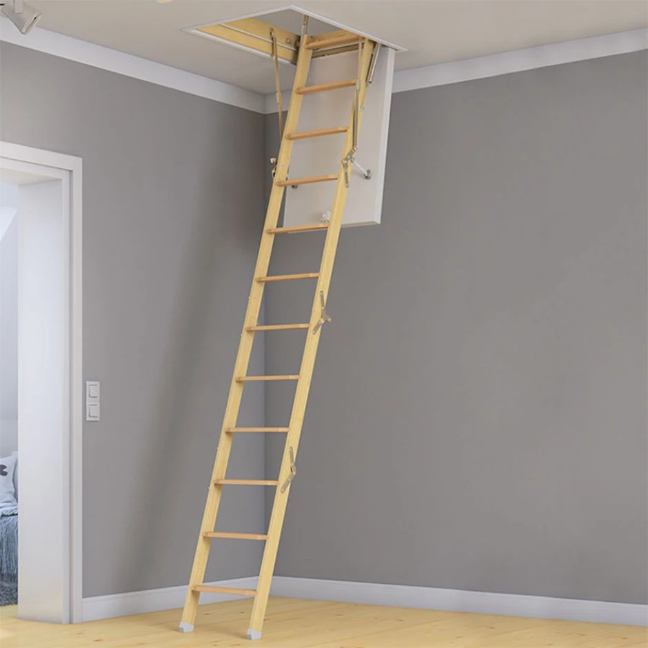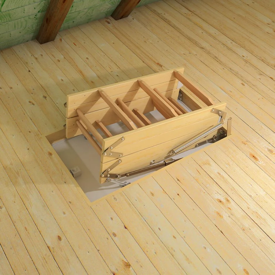 Die 4-teilige Bodentreppe aus stabilem Kiefernholz kann eine Raumhöhe von bis zu 270 cm überwinden.