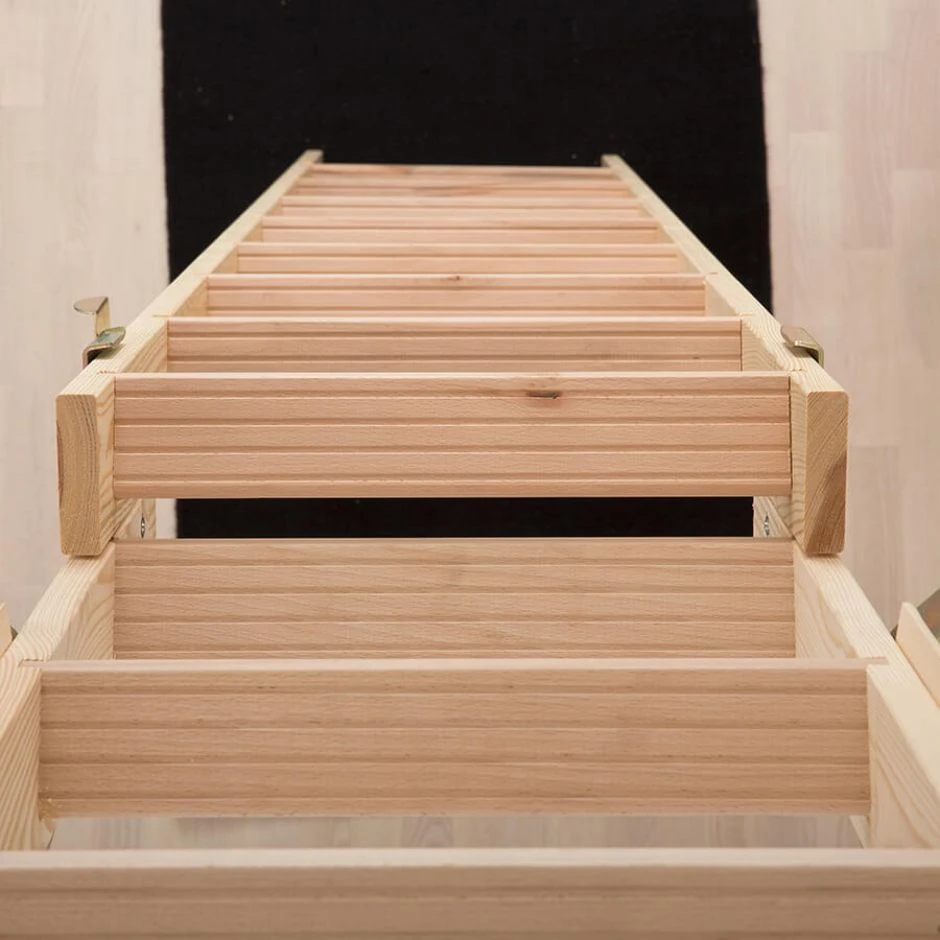 Doch nicht nur der Einbau überzeugt bei der DOLLE clickFIX, die sich für lichte Raumhöhen von 272 cm eignet. Auch die hervorragende Wärmedämmung mit einem U-Wert von 0,49 sorgt dafür, dass Energiekosten eingespart werden können und die Doppeldichtung vermeidet die sonst übliche Bildung von Kondenswasser. Die notwendige Trittsicherheit gewährleisten die Stufen aus Buchenholz.