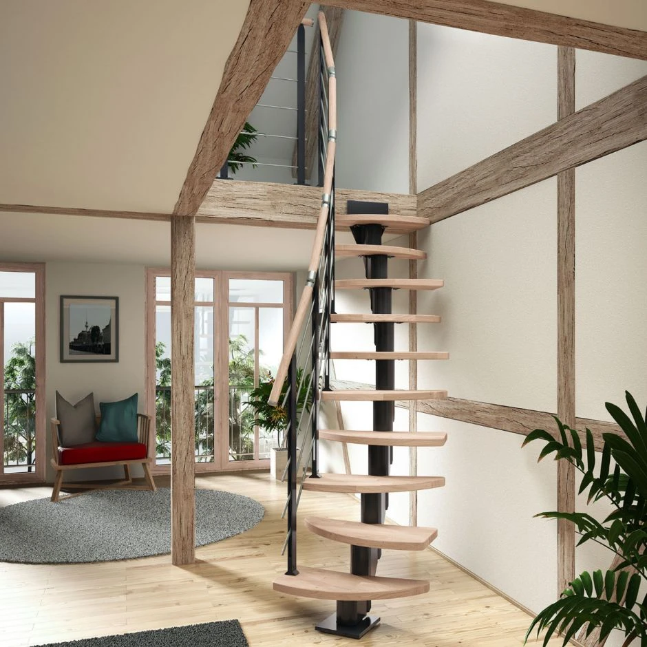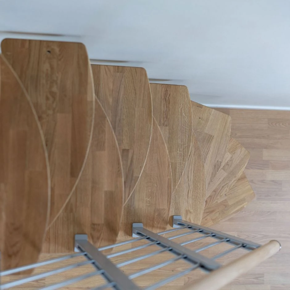 Diese Treppe eignet sich besonders bei sehr geringem Platz. Dank formschön geschwungener Stufen und individuell anpassbarem Treppenverlauf von gerade bis gewendelt (maximal 1/4-gewendelt) passt sie selbst in kleinste Räume.