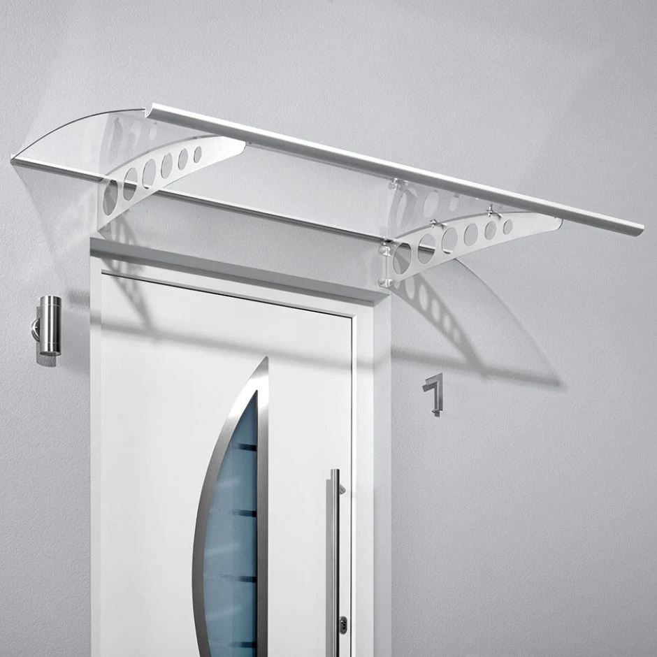 Mit dem Pultvordach PT-ET von Gutta schützen Sie sich und Ihren Eingangsbereich sicher vor Regen und Schnee. Das Design-Vordach besteht aus einem anspruchsvollen Material-Mix aus Edelstahl, Aluminium und klarem Acrylglas. Die Träger mit Loch-Design bestehen aus rostfreiem Edelstahl. Wandanschluss und Regenrinne sind aus silber eloxiertem Aluminium gefertigt. Die transparente 4mm Acrylglas-Abdeckung ist äußerst belastbar und stabil.