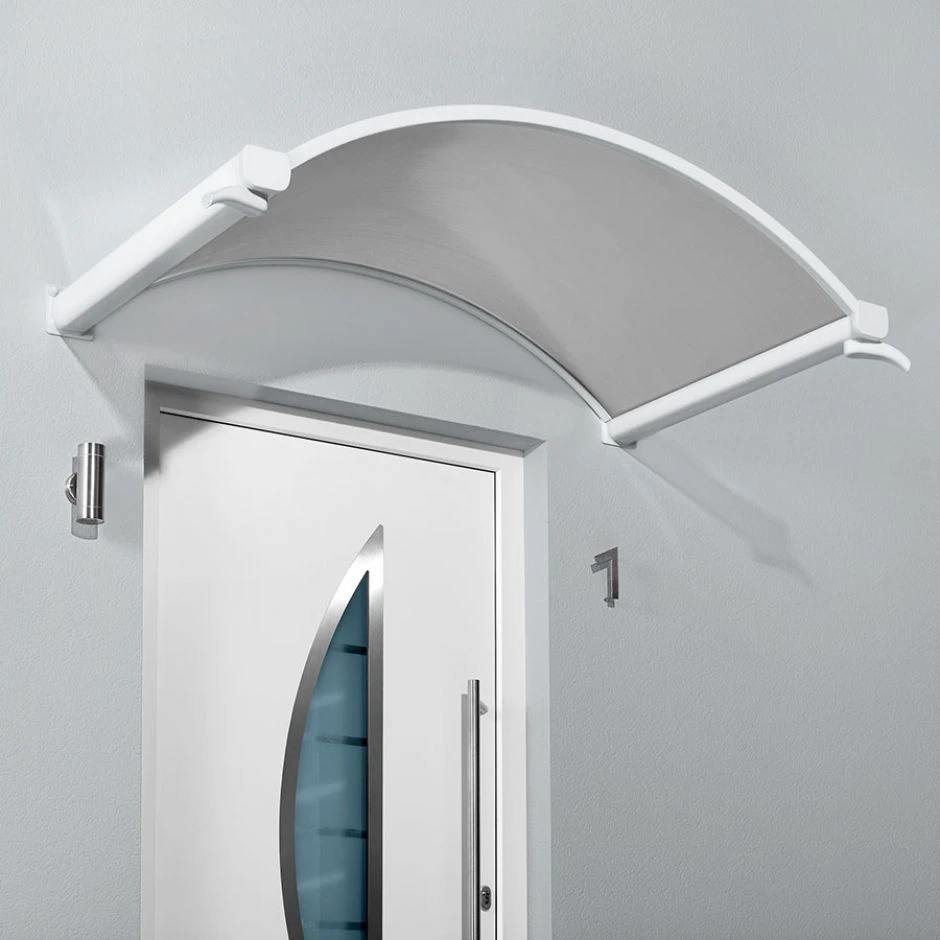 Mit dem dekorativen Rundbogenvordach NO Weiß von Gutta gestalten Sie einen stilvollen Hauseingangsbereich, der Sie sicher vor Niederschlägen schützt. Das dezent weiße Vordach fügt sich unauffällig in seine Umgebung ein und verleiht Ihrem Eingangsbereich einen ansprechenden Abschluss. Die Abdeckung besteht aus belastbarem, klarem Polycarbonat mit einer Stärke von 6mm. Die Profile sowie der Rahmen bestehen aus pulverbeschichtetem Aluminium und sind langfristig vor Witterung geschützt.