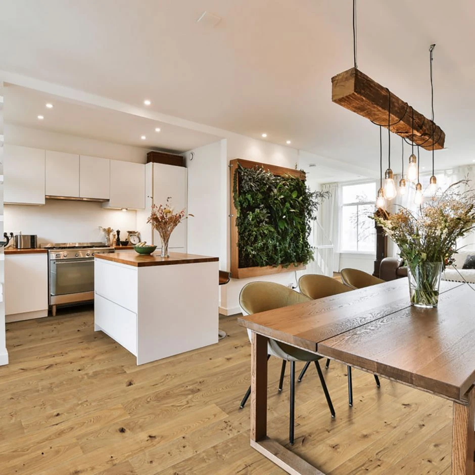 Durch den 3-Schicht-Aufbau, bestehend aus einer 3,5 mm Nutzschicht aus Eiche, einer Mittellage aus Fichtenholz Stäbchen und einem Rückzugfurnier aus Nadelholz, ist der Boden enorm stabil und robust. Die Nutzschicht kann mehrfach abgeschliffen werden um die Schönheit des Bodens auch auf Dauer zu erhalten. Der Boden ist erhältlich in den Oberflächenausführungen Permadur Mattlack und bioTec Öl/Wachs imprägniert, die je nach Anspruch verschiedene Vorteile haben. Die Längskanten der Dielen sind mit V-Fugen versehen um die Dielen noch länger erscheinen zu lassen. Der Boden hat ein 1-Stab Landhausdielen Design mit einer lebhaften Maserung des Holzes.
