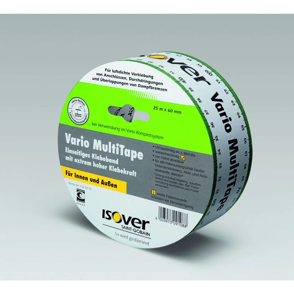 Das Klebeband Vario MultiTape von Isover ist ein Allzweck-Klebeband, das besonders bei der Dachsanierung und der Verklebung von Dampfbremsen verwendet wird. Es hat einen wasserfesten Kleber und haftet auf verschiedenen Untergründen. Dadurch kann es auch zur luftdichten Verklebung von Klimamembranen verwendet werden.