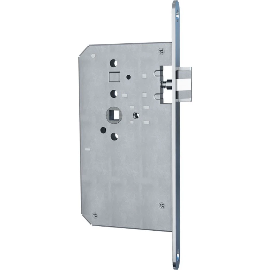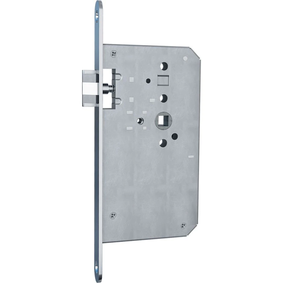 die Außenmaße des patentierten Schlosses entsprechen der DIN-Norm 18251. Somit kann es problemlos in Schlosskastenausfräsungen ohne Ausfräsung für Schlüsselrosetten eingesetzt werden. Der Schlosskasten ist allseitig verschlossen und passt in alle Türen die nach DIN 18101 gefertigt wurden. Die patentierte Schlosstechnik mit integrierter Kupplung verfügt über eine geräuschdämpfende Falle aus Edelstahlfeinguss, einen runden Flachstulp aus 1.4301 Edelstahl und Späneschutzhülsen.
