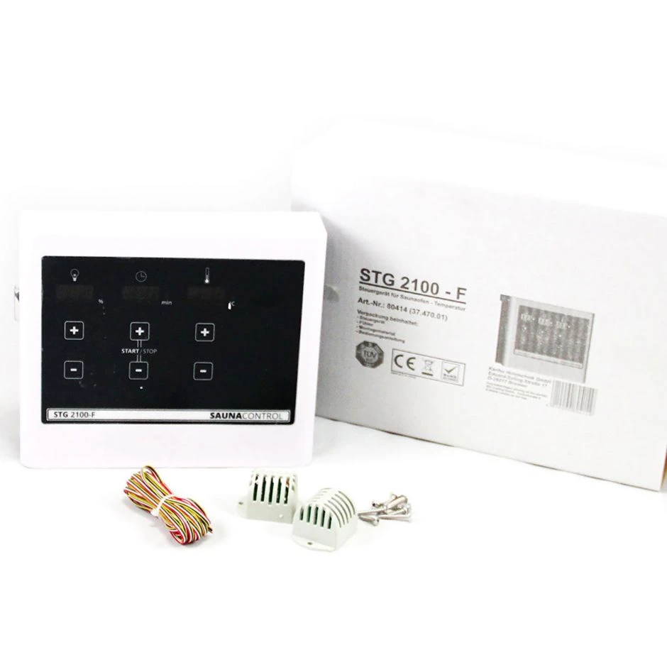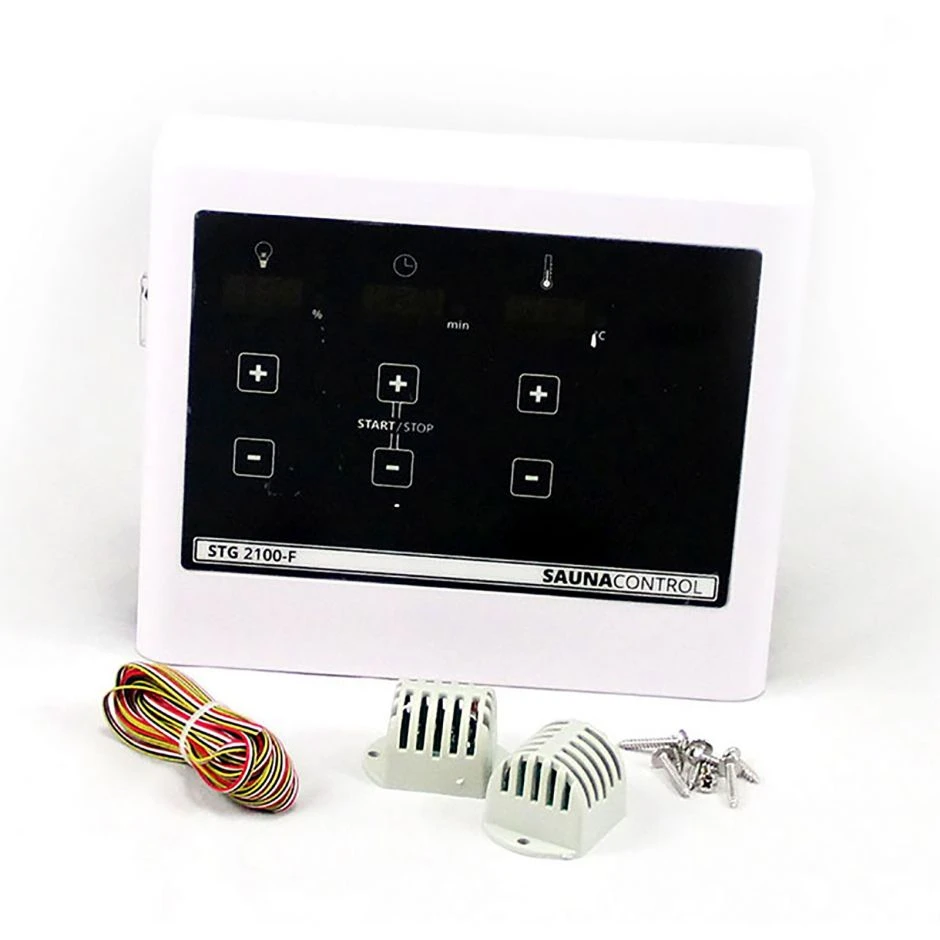Mit diesem externen Steuergerät können Sie ganz einfach Temperaturen und Luftfeuchtigkeit einstellen. Die Temperatur kann stufenlos zwischen 10 und 100 °C gewählt werden. Die Luftfeuchtigkeit kann schrittweise zwischen 5 und 95 % eingestellt werden. So ist neben der klassischen finnischen Sauna auch der Betrieb einer Dampfsauna möglich.