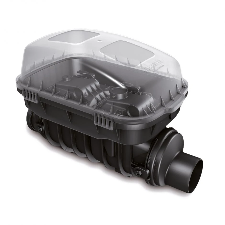 Der Grundkörper hat ein minimales Eigengefälle von 9 mm, einen Zulauf mit Steckmuffe und einen Ablauf mit Spitzende für den direkten Anschluss an Kunststoff-Rohrleitungssysteme. Der Anschluss anderer Außendurchmesser und Rohrmaterialien ist mit Übergängen der Systemhersteller möglich.