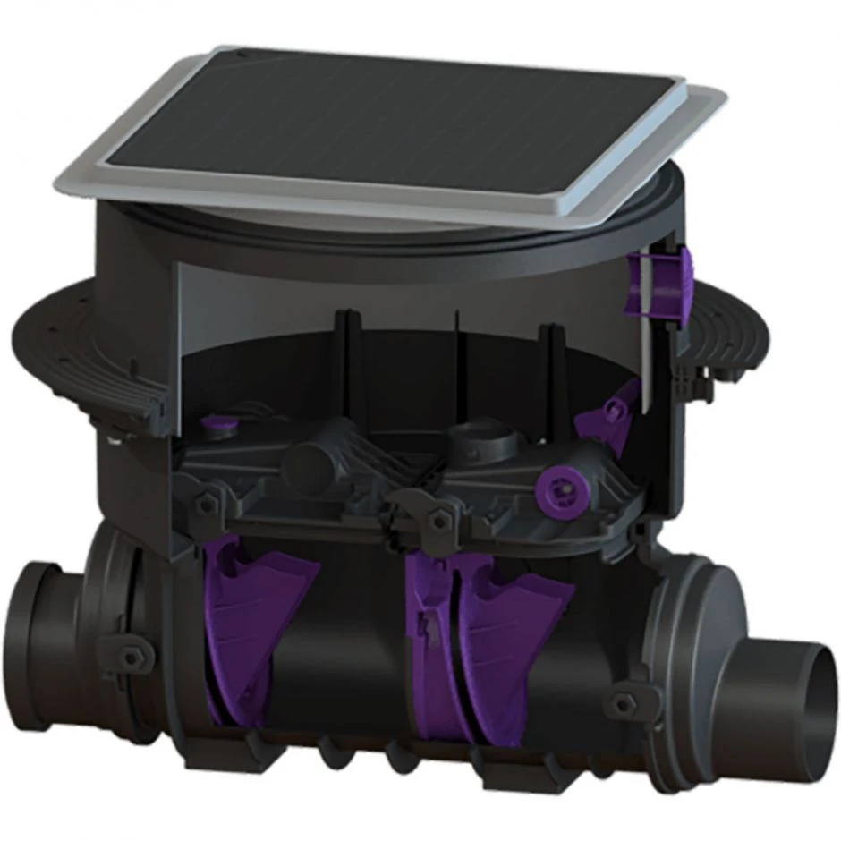 Der Rückstaudoppelverschluss Staufix SWA (73100.10S, 73125.10S, 73150.10S, 73200.10S) für fäkalienfreies Abwasser mit einer schwarzen Abdeckplatte wird in die Bodenplatte eingebaut. Der aus Kunststoff bestehende Rückstaudoppelverschluss hat ein teleskopisches Aufsatzstück für einen stufenlosen Höhen- und Niveauausgleich. Er hat zwei Klappen, die selbsttätig schließen. Eine davon dient als handverriegelbarer Notverschluss.