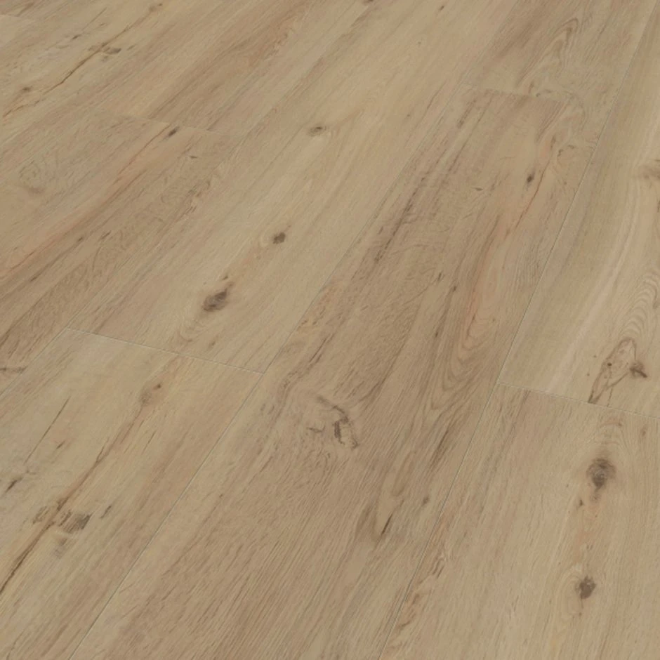 Das Design Eiche geschliffen hat eine klassische 1-Stab Landhausdielen Optik. Die Oberfläche hat eine gebürstete Struktur um die Maserung und Musterung noch Stärker zu betonen und den Boden so lebendiger wirken zu lassen. Die Dielen haben ein hellbraunes Design mit nur vereinzelten Astlöchern.