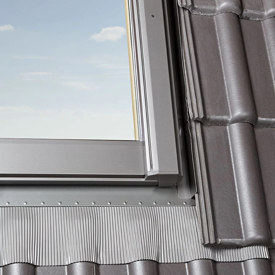 Der hohe seitliche Stehfalz bietet zudem optimalen Schutz vor Regen, Schnee und Eis. Farblich ist der Eindeckrahmen auf die Anthrazit-Metallic-Lackierung der Alueindeckung des Dachfensters abgestimmt.