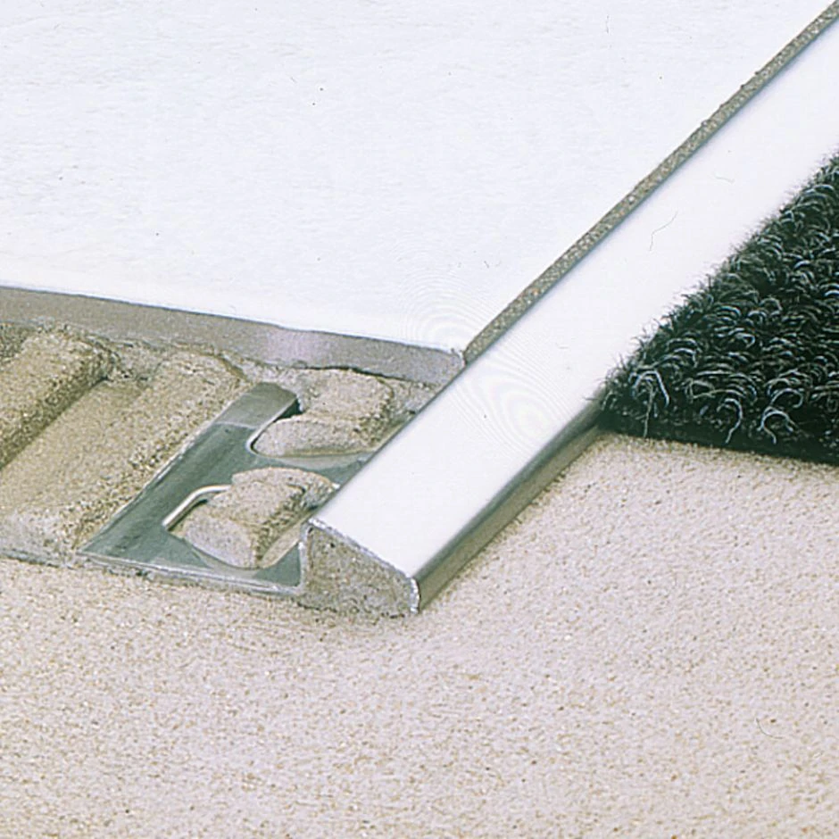 Das solide Übergangsprofil Schlüter-RENO EBU 15mm aus gebürstetem Edelstahl verbindet stufenlos verschieden hohe Bodenbeläge wie z.B. Fliesen und Teppich. Die Kanten der angrenzenden Bodenbeläge werden sicher und sauber abgeschlossen. Der niedrigere Bodenbelag wird dank der 4mm Anschlagskante optimal geschützt. Ein Ausfransen von Teppichkanten wird so verhindert.