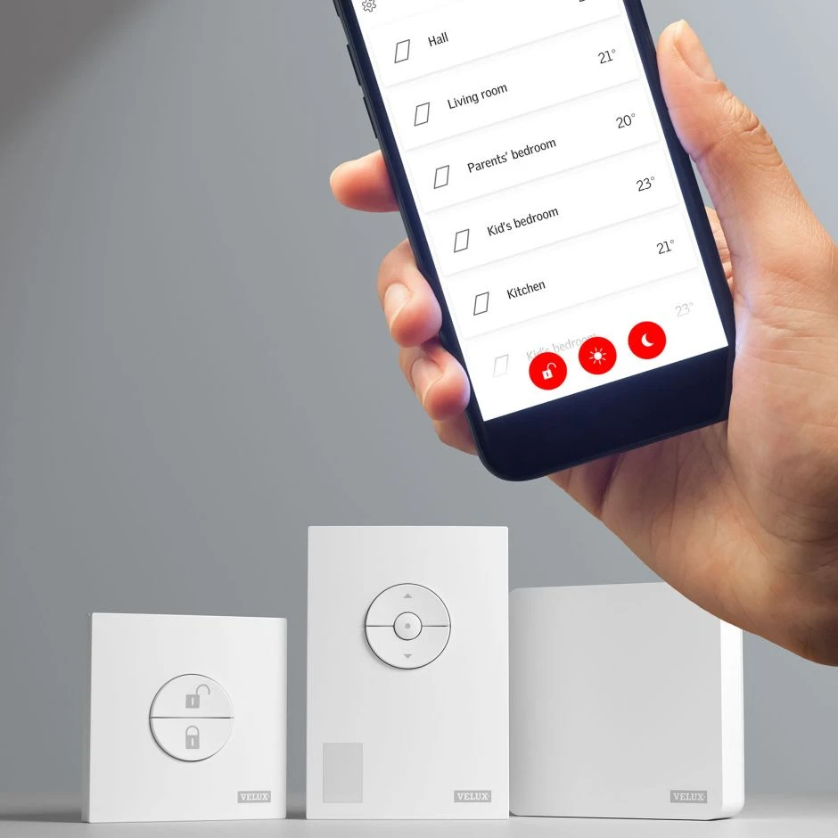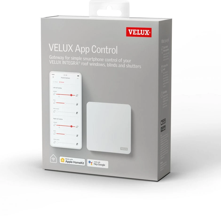 Mit dem VELUX App Control KIG 300 können Sie alle VELUX INTEGRA Produkte bequem von unterwegs aus steuern. Die Bedienung erfolgt per Smartphone oder per Sprachsteuerung durch Kompatibilität zu dem Sprachassistenten Google Assistent oder Apple Home-Kit.