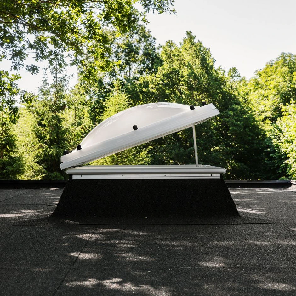 Das VELUX Lichtkuppel Basis-Element CVJ 1210 in elektrischer Ausführung (230V) mit Spindelmotor (300mm Hubhöhe) für unbeheizten Hallen unter flachen Dächern von 0° bis 15°.
